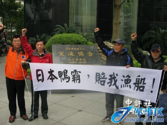 黄定为(左)等保钓人士20日在日本交流协会前抗议,他们表示能理解马英九有关两岸不能联手保钓的谈话。(中评社 李文辉摄)