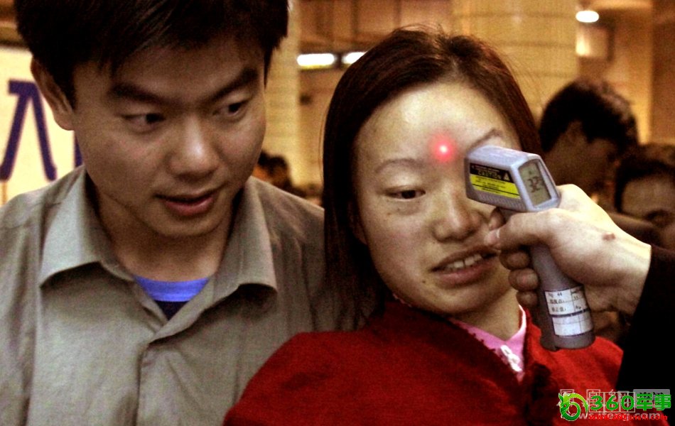 2004年1月4日,广州火车站,一名女旅客正在测量体温,眼前的仪器让她感到害怕,旁边的男子在她耳边小声地说着什么。每逢春运这样的客流高峰,火车站就成为疫情传播的重灾区。