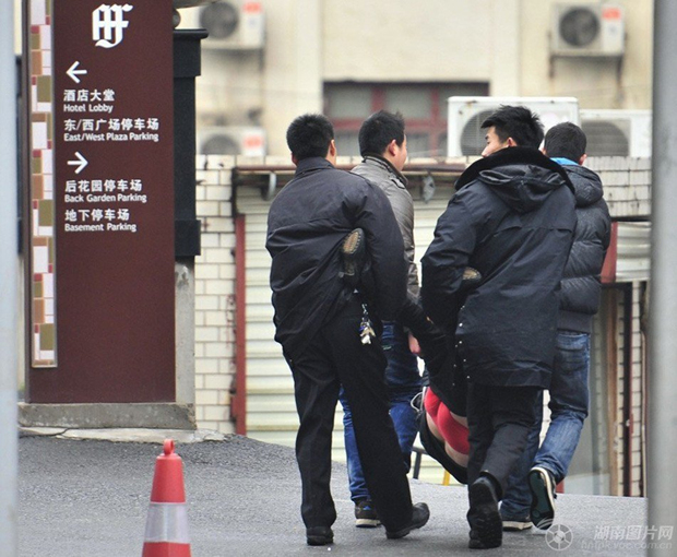 2月19日中午,长沙市八一路富丽华酒店门口,死者王某家属在酒店前讨要说法,随后被保安驱赶离开。