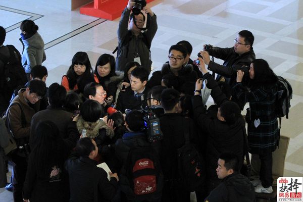 3月3日,北京,围堵政协委员周伯华进行采访的媒体记者。
