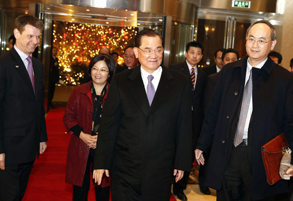 图为连战到达下榻的金融街威斯汀酒店。