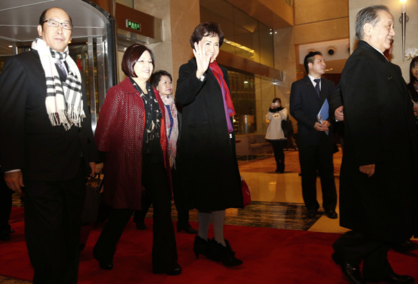 图为连方瑀(中)等人到达连战下榻的金融街威斯汀酒店。