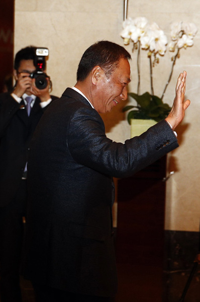 2月24日晚,国民党荣誉主席连战抵达北京,先在北京的鸿海董事长郭台铭和连战一行会合,图为郭台铭走入连战下榻的金融街威斯汀酒店。