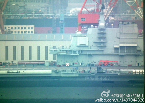 2月25日,辽宁舰正在清理甲板即将起航。