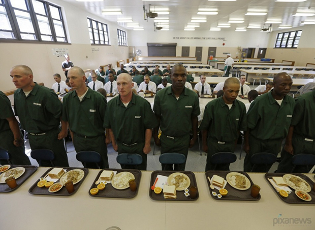 服刑人员等待吃中饭。
