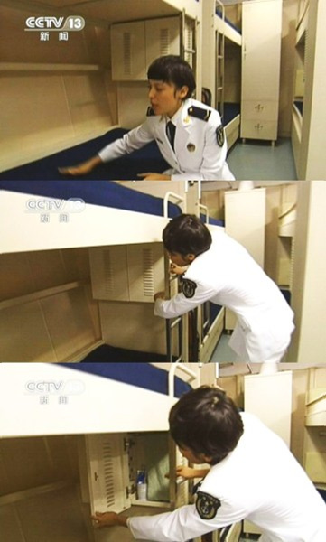 女舰员介绍个人洗漱用品专用柜。