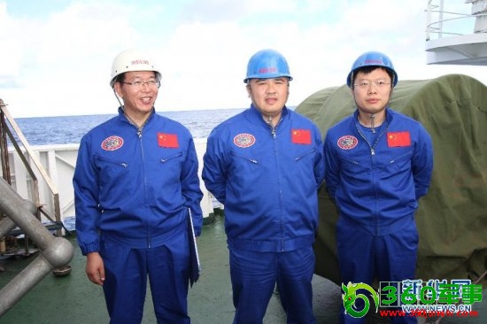 北京时间6月15日7时,3名试航员乘“蛟龙”号载人潜水器开始进行7000米级海试第一次下潜试验。这是参加第一次下潜试验的三名试航员,从左到右为崔维成、叶聪、杨波(6月15日摄)。